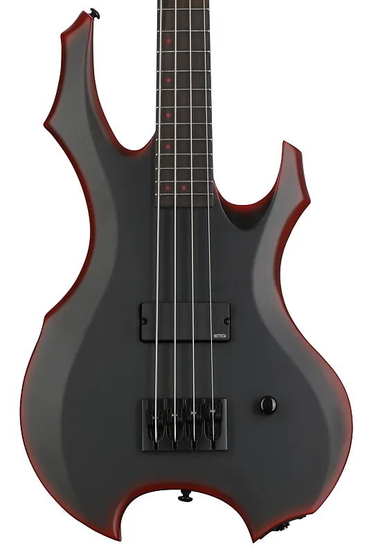 4-струнный электрический бас с корпусом из ольхи, 3-детальная шейка из красного дерева, накладка на гриф из эбенового дерева и 1 активный звукосниматель - красный взрывной сатин.