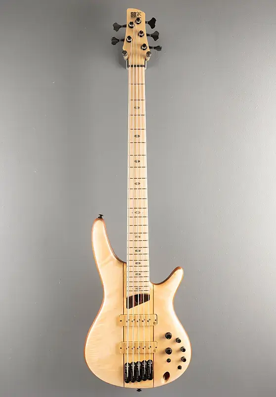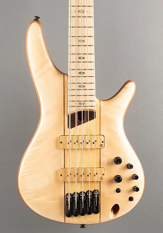 Естественный низкий глянец, верх из огненного клена и ясеня, корпус из африканского махагони, пятиместная шейка Atlas 5 из Panga Panga/Пурпурного дерева с титановыми струнодержателями KTS, гриф из огненного клена радиусом 12″ с инкрустацией из абалона овальной формы и средними ладами, длина мензуры 34″, ширина прорези для струн 1,75″, звукосниматели Nordstrand Big Single для бриджа и грифа с деревянными крышками, индивидуальный 3-полосный эквалайзер Ibanez с переключателем обхода EQ (пассивный регулятор тона на ручке высоких частот) и 3-позиционный переключатель средних частот, мост MR5S и колки Gotoh чугунные/герметичные, вес 8,9 фунта, с чехлом для инструментов
