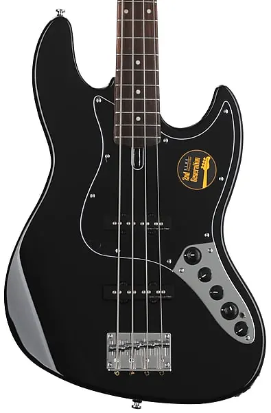 Электрический бас-гитар 4 струны с корпусом из красного дерева, грифом из клена, накладкой на гриф из розового дерева и 2 сингл-койл звукоснимателями - черного цвета.