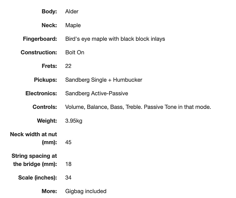Он основан на стандартном басе Sandberg TM, что означает классический корпус с вырезами, креплением шеи на болтах из клена и с хамбакерными звукоснимателями.
