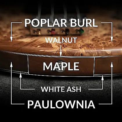 Часто вес инструмента влияет на игровой опыт, и у более крупного инструмента, такого как бас-гитара, больший вес вызывает большую усталость. В то время как многие производители ищут решения, вырезая большие участки древесины корпуса для снижения веса, корпус GB Modern умно создан, чтобы быть такой же легкой без физического изменения корпуса. Ядро корпуса из клена сочетается с легкими крыльями из павловнии, затем оно покрывается великолепным топом из кленовой карликовой древесины и белого ясеня на задней стороне, что в итоге создает сочетание отличных тоновых пород, которые превосходны как по звучанию, так и по внешнему виду.