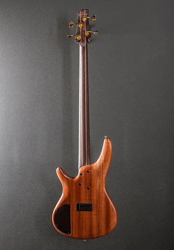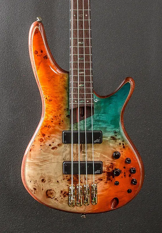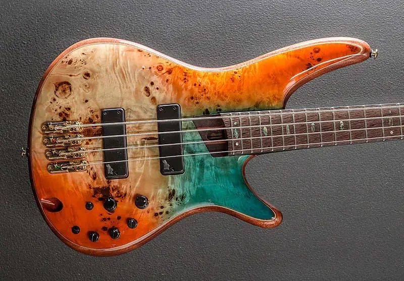 Осеннее закатное небо, верх из капа тополя на корпусе из африканского махагони, шея Atlas 4 формы из 5 частей Пангa Пангa/Пурпурного дерева с титановыми стержнями KTS, гриф из Пангa Пангa с радиусом 12 дюймов, инкрустация из перламутра в форме овала и средние лады, длина мензуры 34 дюйма, ширина верхнего порожка 1,5 дюйма, звукосниматели мост и гриф Aguilar DCB, индивидуальный эквалайзер Ibanez 3-полосный с переключателем обхода EQ (пассивный регулятор тембра на ручке высоких частот) и 3-позиционный переключатель частоты средних тонов, мост MR5S и колки Gotoh литые/с герметизацией, вес 8,8 фунтов, с чехлом для переноски