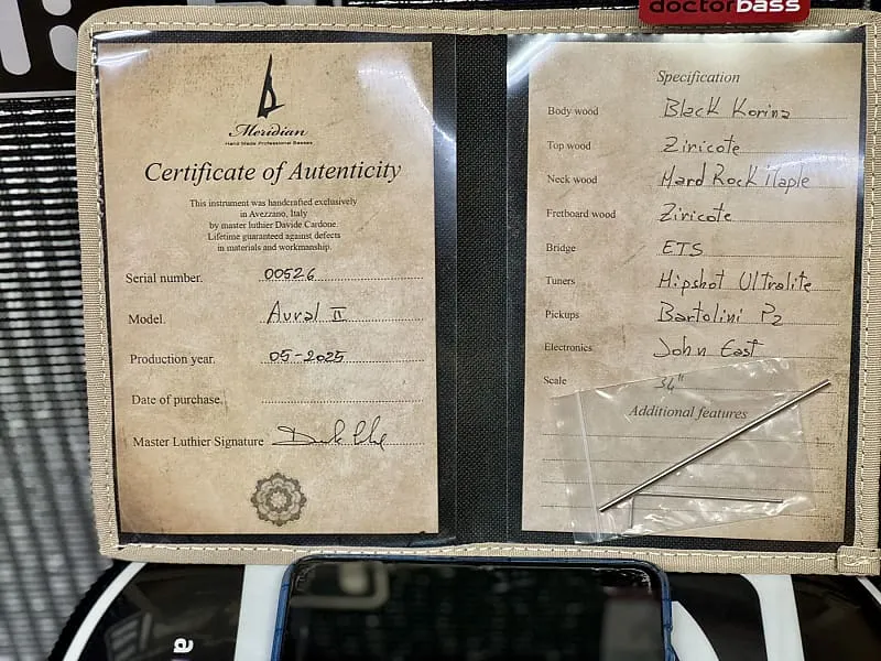 2025 год отмечает наше 20-летие как магазина, специализирующегося на бас-гитарах, поэтому Давиде любезно сделал крутую латунную пластину с выгравированным логотипом и датой и установил ее на заднюю часть грифа.