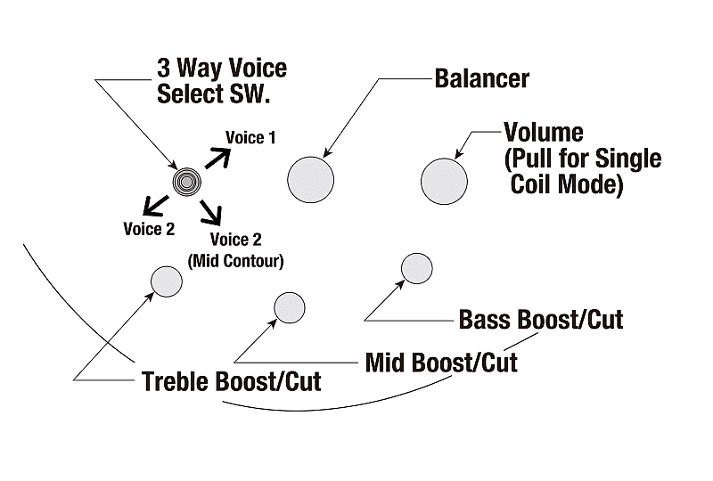 - Переключатель Fishman Fluence Voice Select Переключатель Voice Selector предоставляет музыканту широкий спектр звуков для всех стилей игры. Voice 1 (Пассивный): Классический, полный и округлый Voice 2 (Активный): Полный диапазон частот, динамичный Voice 2 (Активный с контуром Mids): Фанк, Hi-Fi с вырезанными средними Режим Single Coil: Те же голоса, что и выше, но с более узким магнитным полем