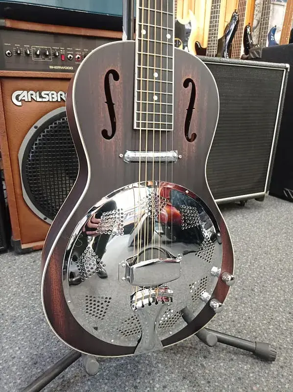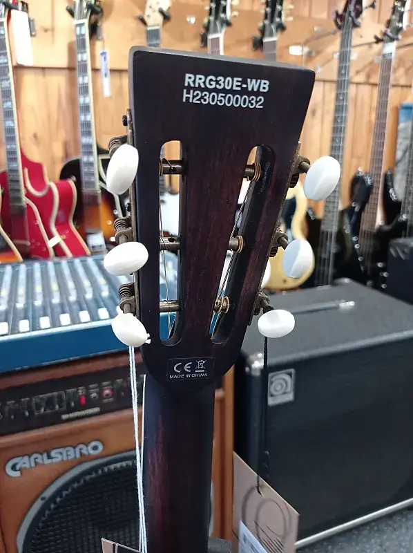 RRG30E, верхняя дека из махагони, корпус и обечайки из махагони, гриф из махагони, накладка грифа из блэквуда, бридж клен/эбен, звукосниматель Lipstick (пассивный), регуляторы громкости и тона, ширина порожка 43 мм, 19 ладов, алюминиевый резонатор, двойной тросс-стержень.