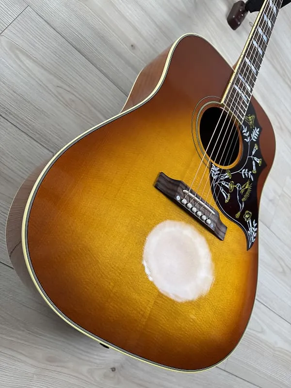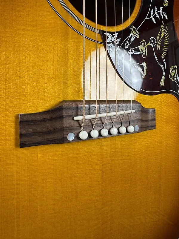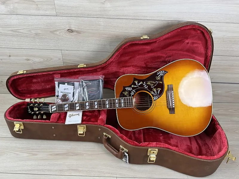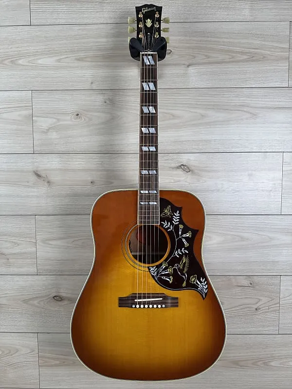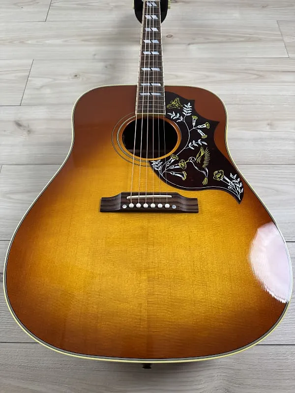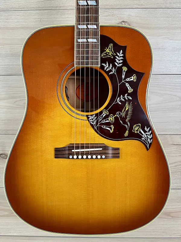 Неповторимая Gibson Hummingbird признана многими одной из самых выдающихся акустических гитар, когда-либо созданных. Новая Hummingbird Original сочетает винтажные элементы и современное высококачественное исполнение. Оснащена золочеными колками Gotoh Keystone, двойной античной окантовкой, традиционной накладкой на натяжной стержень (truss rod) Hummingbird и костью на порожке и седле.