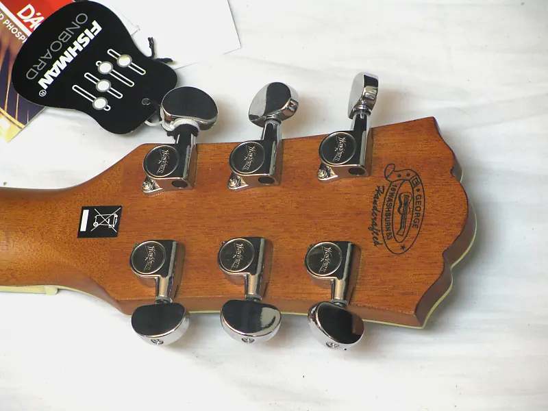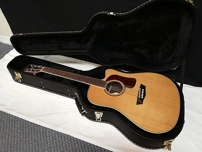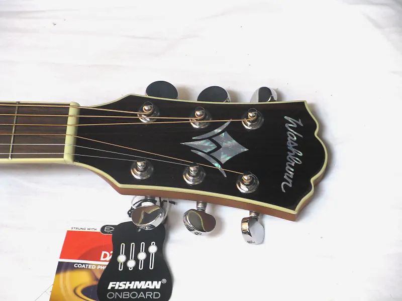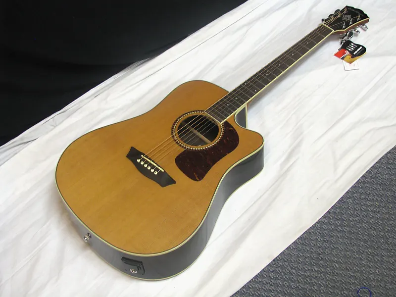 Акустико-электрическая гитара Washburn Heritage Series с вырезом dreadnought, верхняя декa из цельного кедра, задняя часть и обечайка из розового дерева, с черепаховым медиаторным щитом, оснащенная 4-полосным эквалайзером Barcus Berry с встроенным тюнером.