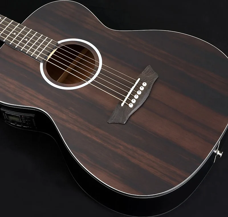 Корпус в винтажном стиле на Deep Forest Ebony FE небольшой и удобный. Звуковая комбинация этого слегка уменьшенного корпуса с выбранными породами древесины действительно особенная. Смеси древесины естественно наполнены глубокими, насыщенными обертонами, которые подчеркивают низкие частоты. Меньший корпус и распорки обеспечивают также четкость и сбалансированность звучания. Нужно переключиться с акустики на усиленное звучание? Без проблем - Deep Forest Ebony FE оснащен активной электроникой Barcus Berry, включая встроенный тюнер.