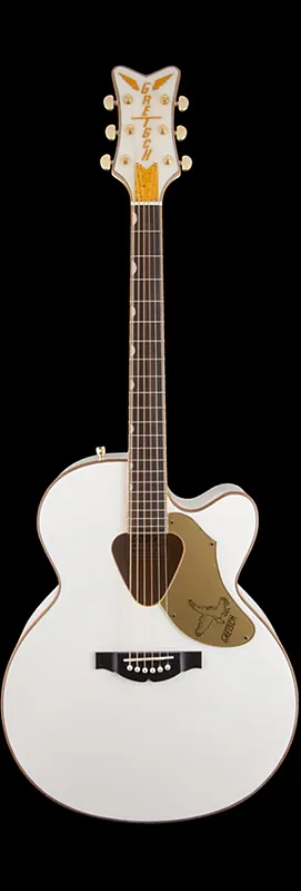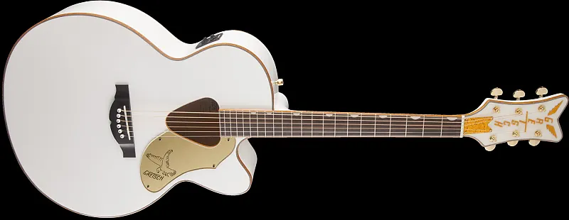 Ее корпус с вырезом типа джамбо включает ослепляющую золотую блестящую окантовку на верхней деке, задней части, звуковом отверстии, грифе и головке грифа. Другие высококлассные особенности включают цельную ель в качестве верхней деки с фигурными X-образными планками, классическое треугольное звуковое отверстие Rancher, кленовые обечайки и выгнутую заднюю часть, гриф из махагони, грифовую накладку из лавра с 21 ладом и инкрустацией Neo-Classic в виде маленьких миниатюрных пазов, головку грифа V-образной формы с вертикальным логотипом "Gretsch" в блестках, компенсированный поддон под струны из лавра, делюкс колки и золотая фурнитура.