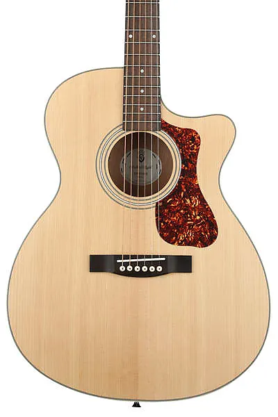 Акустико-электрогитара с цельной верхней декой из ситка ели, боками и грифом из красного дерева, арочной задней декой из красного дерева и накладкой грифа из индийского палисандра - натуральный цвет.