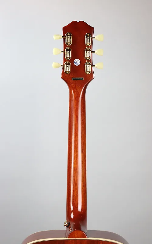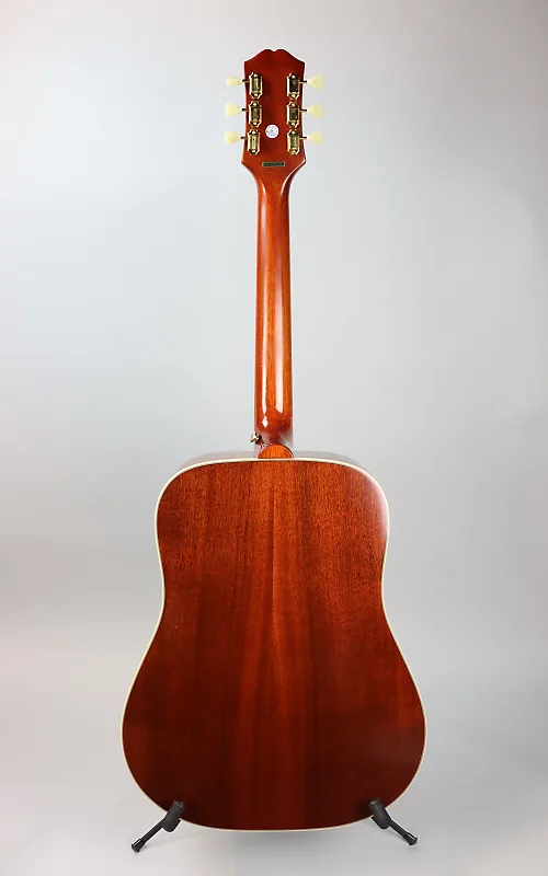 Характеристики: корпус dreadnought с квадратными плечами; верхняя дека из цельной ели ситка; задняя дека и боковины из цельного махагони; гриф из махагони с закругленной формой "C"; грифовая накладка из индийского лавра; длина мензуры 24,724"; ширина верхнего порожка 1,692"; 20 ладов среднего размера Jumbo; верхний порожек и седло из кости; подставка из индийского лавра с реверсивным корпусом; колки Epiphone Deluxe. Глянцевая отделка Aged Cherry Sunburst.