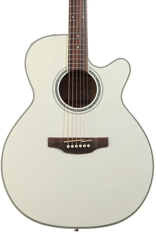 Акустико-электрическая гитара с верхней декой из ели, задней и боковыми сторонами из клена, гриф из клена и накладкой на гриф из розового дерева - перламутрово-белая.