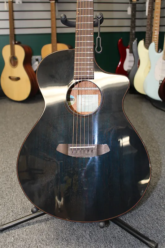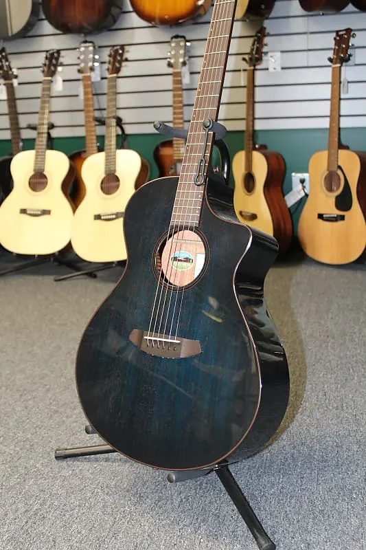 Это совершенно новая акустико-электрическая гитара Breedlove Rainforest S Concert Papillon CE. Верхняя дека, задняя часть и обечайки выполнены из африканского махагони, и гитара представлена в синем цвете Papillon для уникального внешнего вида.