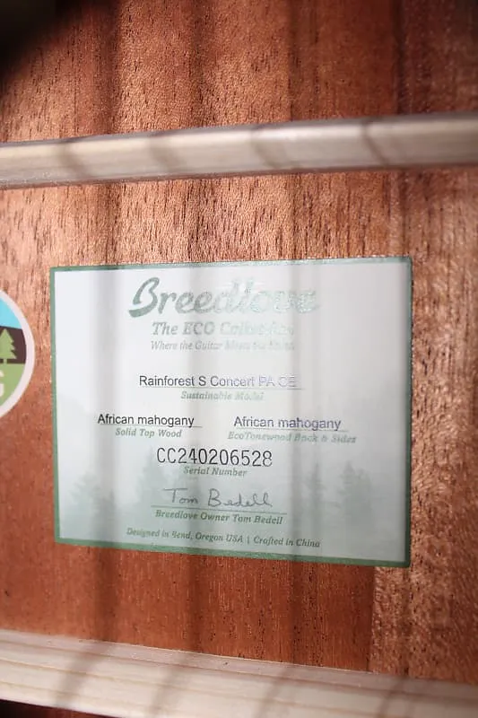 С сайта Breedlove: "Поддержите окружающую среду и звучите лучше, чем когда-либо, с технологией EcoTonewood от Breedlove, экологичной и обладающей превосходным звуком. Корпус Concert с тонкой грифовой шейкой и сплошной верхней декой из африканского махагони сочетает фирменный комфорт и универсальность Breedlove с теплым фокусом на средних частотах, который ценят авторы песен, музыканты в стиле roots rock и фолк. Откройте свою душу! Стильный вырез позволяет легко добираться до каждого лада, а мерцающий блестящий финиш Papillon переносит всю красоту тропического леса прямо в ваши руки."