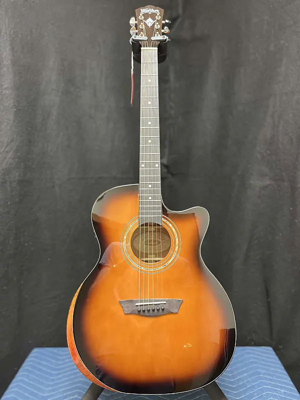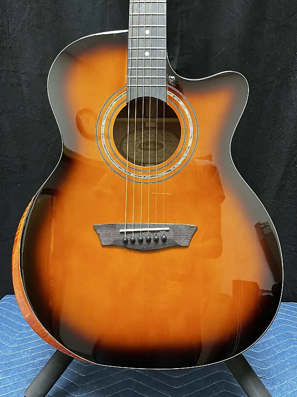 У нас есть акустико-электрогитара Washburn Comfort G10CE цвета Sunburst! Акустико-электрическая гитара с верхней дека из ламинированного Ситковского ели, задней частью и обечайками из Okoume, гриф из Okoume и грифовой накладкой из пурпурного дерева. Совершенно новая!