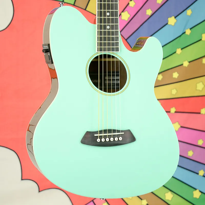 Стилизованная в ярко-зеленый цвет «серф», серия Talman TCY10E от Ibanez - это акустико-электрическая гитара, созданная для сцены. Ее звонкая верхняя дека из ели и задняя дека с обечайками из сапеле обеспечивают как приятное звучание, так и необычный дизайн с двойным вырезом. Гриф, выполненный из окуме, оснащен 20 ладами и грифом длиной 26 дюймов из фиолетового дерева.