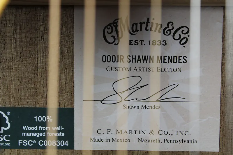 Мастерская Martin Custom Shop с гордостью сотрудничала с самоуком и популярным исполнителем Шоном Мендесом, чтобы создать модель 000JR-10E Shawn Mendes Custom Signature Edition. Мендес хотел, чтобы материалы для его подписи были экологически устойчивыми и чтобы гитара была доступна всем его поклонникам, даже тем, кто только начинает свой музыкальный путь. Martin откликнулись на эту просьбу и разработали модель, изготовленную из 100% сертифицированных древесных материалов FSC в размере 000 Junior с 14 ладами, что означает, что это слегка уменьшенная версия гитары стиля Auditorium, которая делает ее максимально удобной для музыкантов любого роста и уровня мастерства. Гитара украшена элементом дизайна, вдохновленным одной из татуировок Мендеса - ласточкой на его руке, которую Martin выгравировали на инструменте. крылья моста. Ласточки имеют особое значение для Мендеса, потому что известно, что они покидают свой дом, но всегда возвращаются, подобно гастролирующему музыканту. Другие элементы персонализации включают скрытую вдохновляющую фразу внутри корпуса гитары, как пасхальное яйцо для его фанатов. На модели также есть подпись артиста в верхней части грифовой доски. Гитара оснащена электроникой Fishman Sonitone. В комплект входит яркий синий чехол, сделанный из переработанных пластиковых бутылок, извлеченных из океана, и он соответствует стандарту Global Recycled Standard.