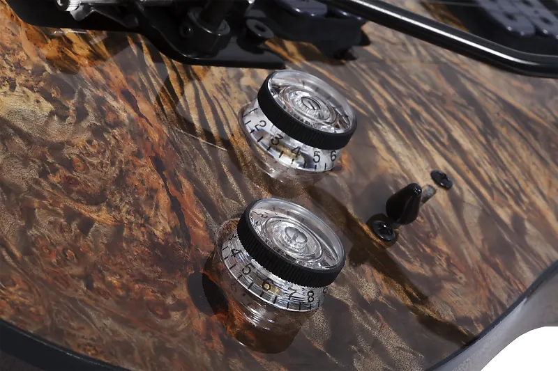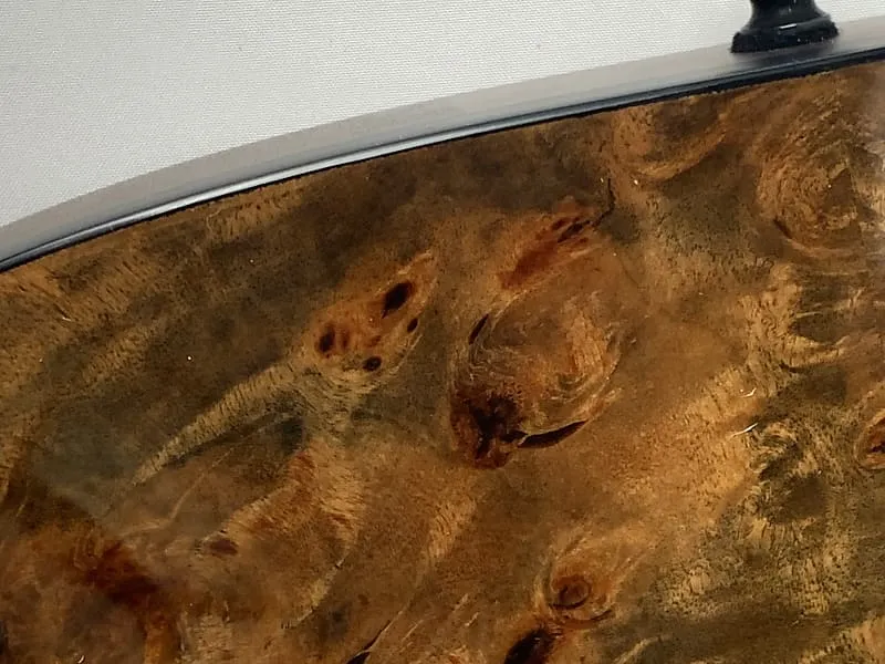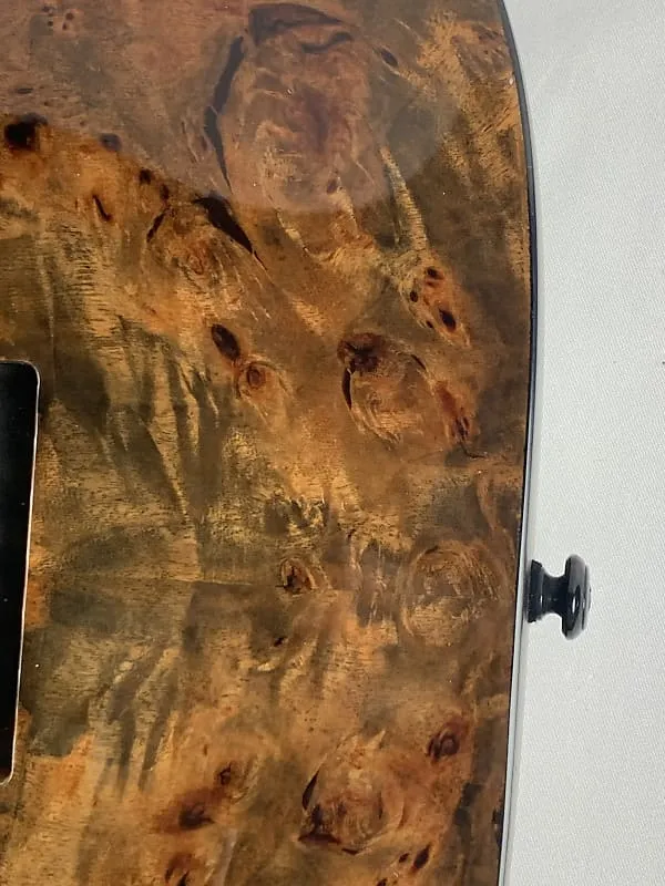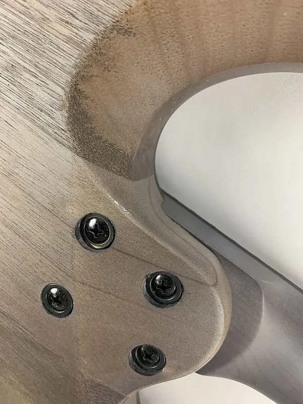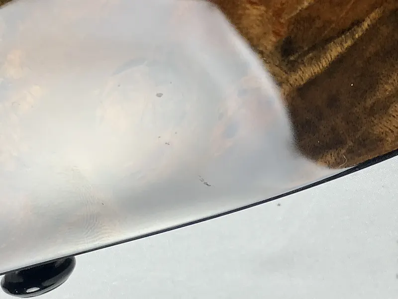 Есть пара маленьких следов лака, которые можно заметить, если держать под светом. Я сделал несколько фотографий с разных ракурсов крупным планом, чтобы показать, что их нельзя увидеть, если не держать под светом и не присматриваться. Я знаю, что это едва ли стоит упоминания, но мы не можем принимать возврат из-за этого. Также есть немного белого на изогнутой части сзади возле верхнего винта. Я знаю, очень маленькое.