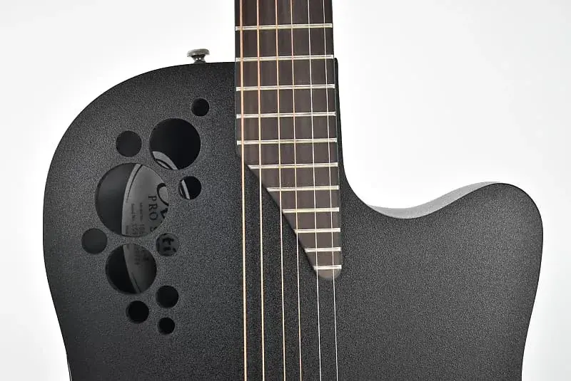 Ovation Pro Series Elite 1868TX-5-G, акустическая гитара, сверхмелкий корпус из лирахорды, верх из массива ели, несколько резонаторов (только на стороне баса), кленовый гриф, гриф из орехового дерева, мензура 642 мм, гайка с дитом 42,80 мм, бридж из орехового дерева, предусилитель OP Pro со встроенным тюнером, новая форма грифа и соединение грифа с головкой грифа; цвет черный текстурированный; оптимизированные X-образные распорки: более мягкий профиль "C"; новый угол наклона лобовой пластины; Новый переход между шейкой и головкой