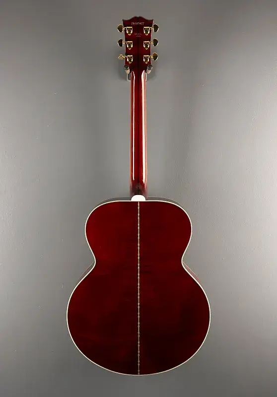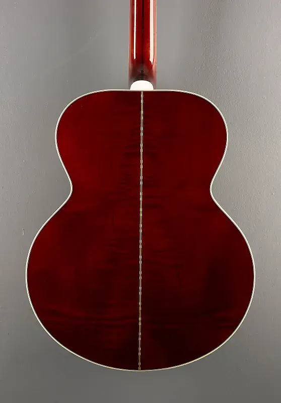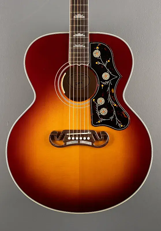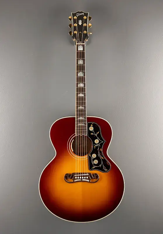 Цвет Autumnburst, форма корпуса Super Jumbo SJ-200, глянцевое покрытие нитроцеллюлозным лаком, верх из ели Sitka AAA, традиционная ручная скосная X-образная распорка, задняя часть и обечайки из клена Flame AAA, 5-слойная окантовка верха и 3-слойная окантовка задней части, двухсекционная шея из клена с закругленной формой, накладка грифа из индийского палисандра с радиусом 12” и инкрустацией Mother of Pearl Graduated Crown, стандартные лады, длина мензуры 25,5”, Ширина гитарного порожка 1,725 дюйма, механические колки Grover Rotomatic, с системой звукоснимателей L.R. Baggs Anthem и жестким чехлом