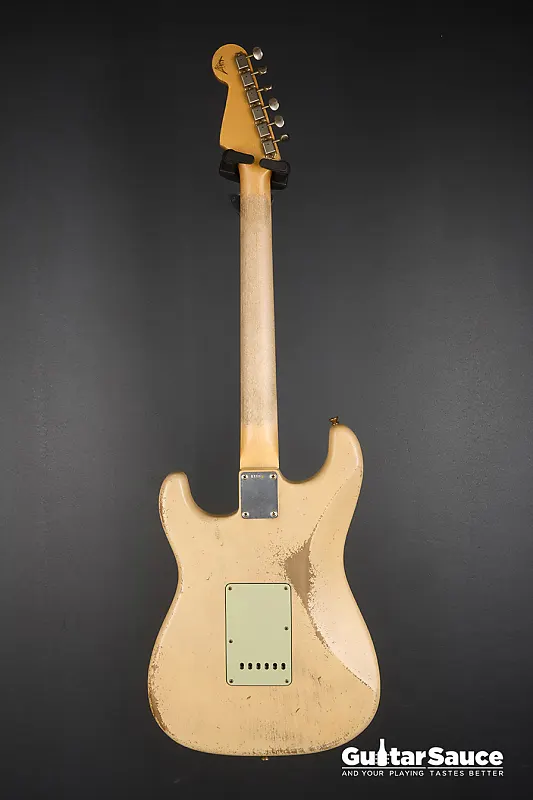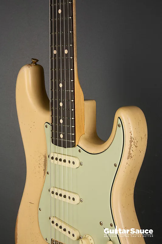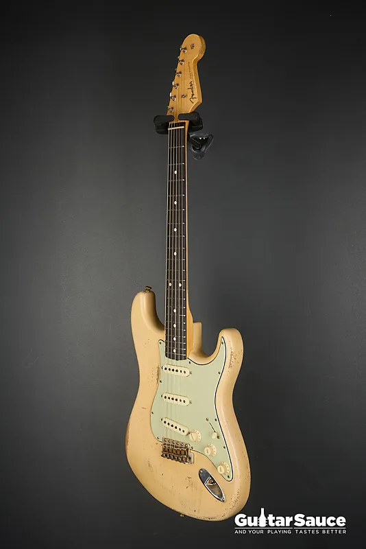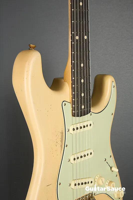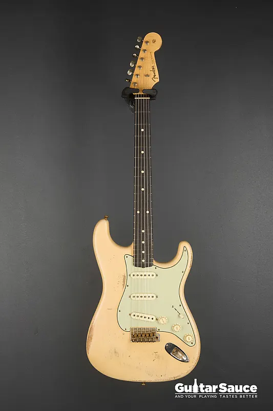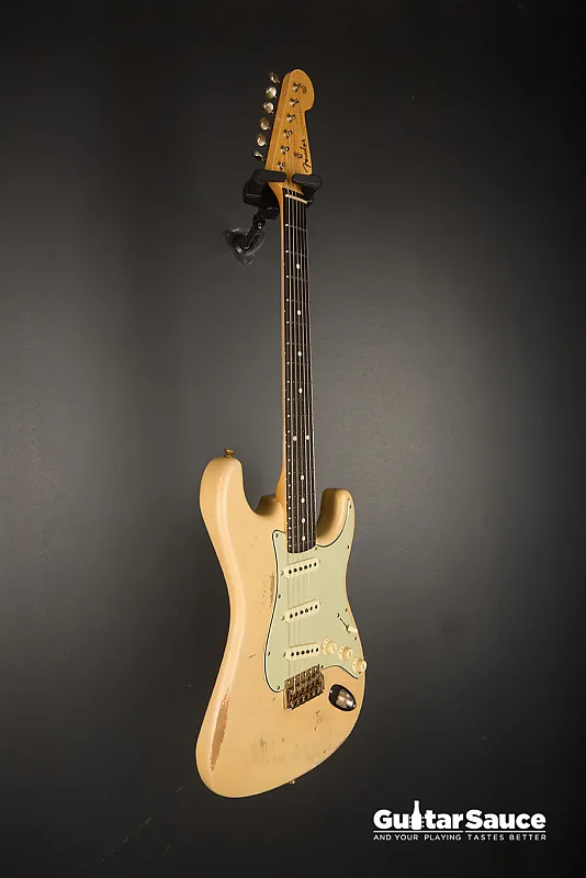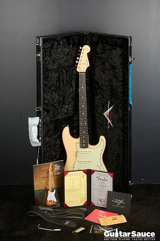 Эта гитара Fender Custom Shop Masterbuilt '59 Stratocaster Relic была создана в 2025 году Энди Хиксом, одним из самых талантливых мастеров Fender. Вдохновленная легендарными моделями 1959 года, эта гитара передает всю магию золотой эры благодаря мастерскому уровню исполнения. Корпус изготовлен из легкого отобранного ольхового дерева ("Sort for Lightweight") и покрыт потрясающим лаком Vintage Blonde на основе нитроцеллюлозы с обработкой relic, которая достоверно воспроизводит годы естественного износа. Гриф выполнен из кленовой древесины, распиленной продольно, с комфортным профилем '59 Oval "C", а накладка на гриф из темной розового дерева с комбинированным радиусом (9,5" до 12") и узкими высокими ладами 6100. Округленные края обеспечивают шелковисто-гладкое ощущение при игре. Электроника включает полный набор ручных катушек Fender Custom Shop Strat M.D. LTD (гриф, середина и бридж), эксклюзивных для серии Masterbuilt. Проводка Strat Blender обеспечивает отличную универсальность с 5-позиционным переключателем, потенциометрами 250K и конденсатором 0,10. обеспечивая широкую тональную палитру - от классических винтажных тембров до современной яркости и четкости. Винтажная фурнитура включает в себя реликовый тремоло-бридж Strat, тюнеры в винтажном стиле и трехслойный пикгард в стиле 60-х цвета мятного зеленого. Задняя крышка также подвергнута реликовке для соответствия, а шейная пластина имеет гравировку с кодом Masterbuilt R119. В комплект входит оригинальный черный кофр Fender G&G, ремень, сертификат подлинности (COA), подписанный Энди Хиксом, производственный лист, рычаг тремоло, крышка для пепельницы и все оригинальные аксессуары из кейса. По-настоящему выдающаяся гитара как для коллекционеров, так и для серьезных музыкантов.