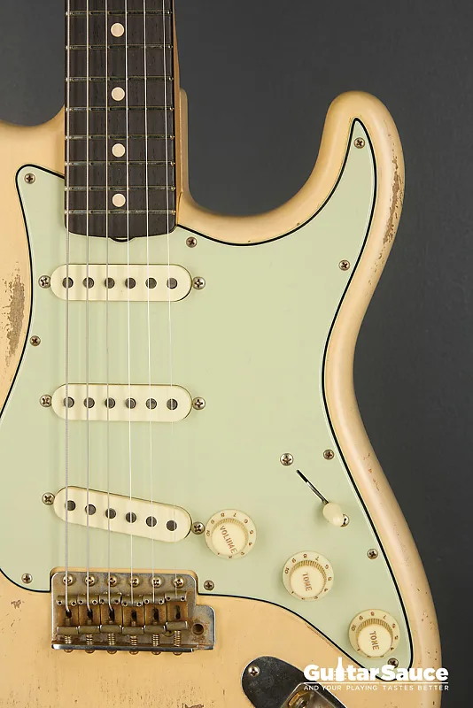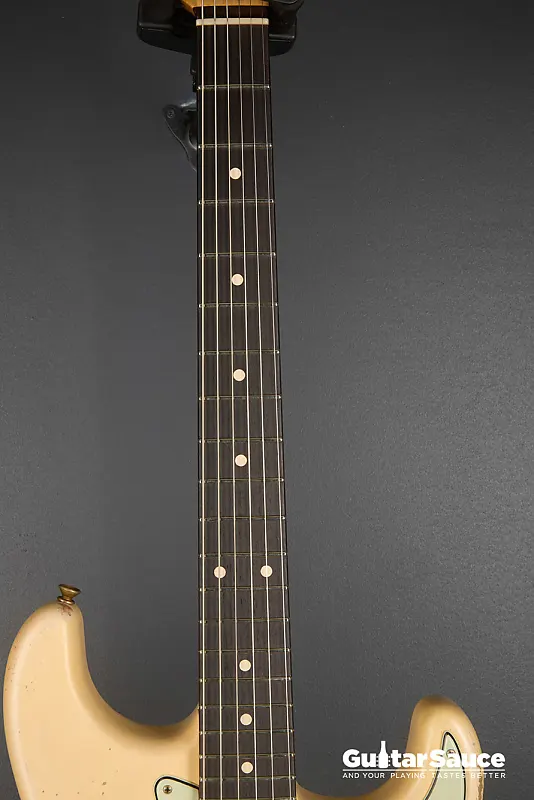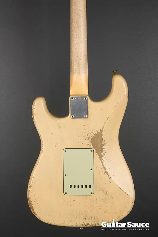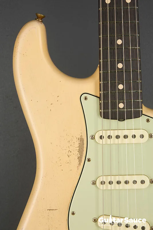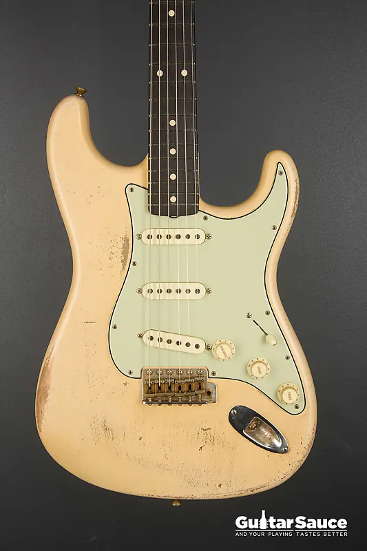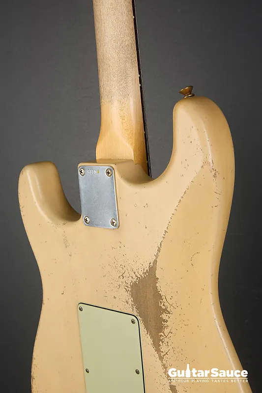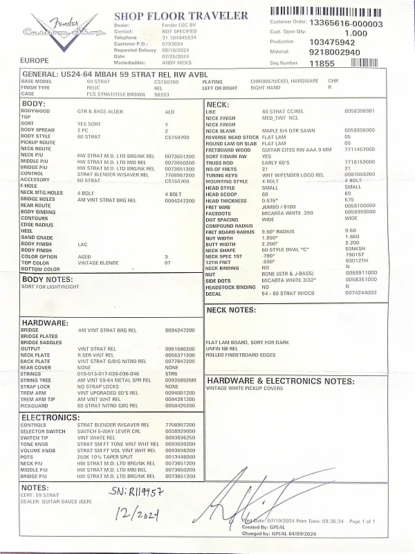 Эта гитара Fender Custom Shop Masterbuilt '59 Stratocaster Relic была создана в 2025 году Энди Хиксом, одним из самых талантливых мастеров Fender. Вдохновленная легендарными моделями 1959 года, эта гитара передает всю магию золотой эры благодаря мастерскому уровню исполнения. Корпус изготовлен из легкого отобранного ольхового дерева ("Sort for Lightweight") и покрыт потрясающим лаком Vintage Blonde на основе нитроцеллюлозы с обработкой relic, которая достоверно воспроизводит годы естественного износа. Гриф выполнен из кленовой древесины, распиленной продольно, с комфортным профилем '59 Oval "C", а накладка на гриф из темной розового дерева с комбинированным радиусом (9,5" до 12") и узкими высокими ладами 6100. Округленные края обеспечивают шелковисто-гладкое ощущение при игре. Электроника включает полный набор ручных катушек Fender Custom Shop Strat M.D. LTD (гриф, середина и бридж), эксклюзивных для серии Masterbuilt. Проводка Strat Blender обеспечивает отличную универсальность с 5-позиционным переключателем, потенциометрами 250K и конденсатором 0,10. обеспечивая широкую тональную палитру - от классических винтажных тембров до современной яркости и четкости. Винтажная фурнитура включает в себя реликовый тремоло-бридж Strat, тюнеры в винтажном стиле и трехслойный пикгард в стиле 60-х цвета мятного зеленого. Задняя крышка также подвергнута реликовке для соответствия, а шейная пластина имеет гравировку с кодом Masterbuilt R119. В комплект входит оригинальный черный кофр Fender G&G, ремень, сертификат подлинности (COA), подписанный Энди Хиксом, производственный лист, рычаг тремоло, крышка для пепельницы и все оригинальные аксессуары из кейса. По-настоящему выдающаяся гитара как для коллекционеров, так и для серьезных музыкантов.