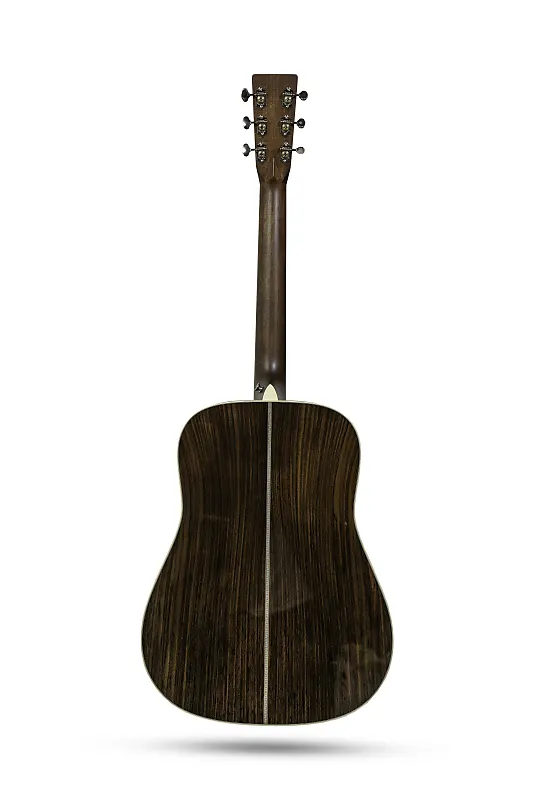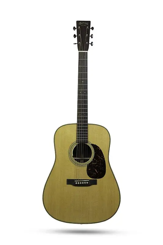 HD-28E с задней и боковыми частями из розового дерева, грифом и мостиком из эбена, верхняя дека из ели ситка с отделкой в виде елочки. Длина мензуры 25,4", ширина порожка 1 3/4", открытые колки. Заводская установка электроники L.R. Baggs.