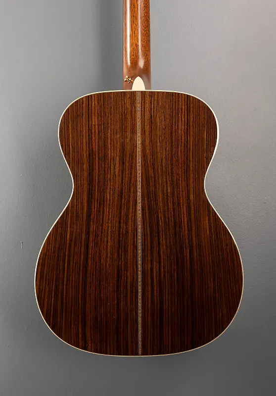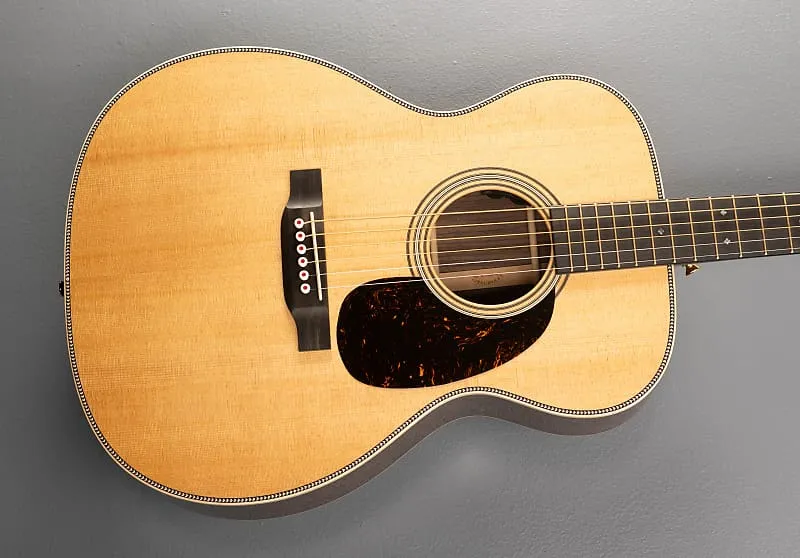 Натуральная, форма корпуса 000-14 Fret, верх из массива ели с VTS, X-образная скелетная распорка из ели Адирондак с VTS, розетка Style 28 с многоцветной полоской, европейская окантовка из клена с фактурой «флейм» с выразительным узором “шеврон” на верхней деке и многоцветной полосатой задней декой.
