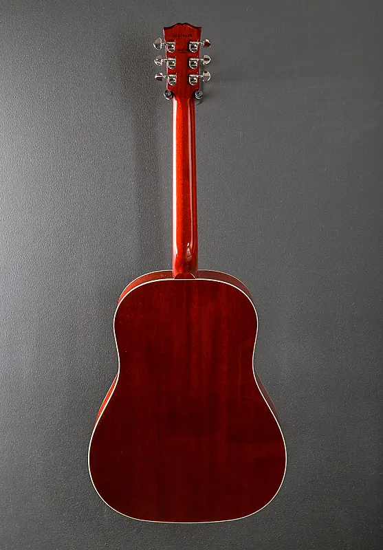 Цвет Cherry, корпус J-45 с округлым плечом, глянцевая отделка из нитроцеллюлозного лака, верхняя дека из пихты Ситка, традиционная рукотворная скаллопированная X-штриховка, многослойная окантовка верха и однослойная окантовка задней деки, задняя дека и обечайки из махагони, шея из махагони с сужением Slim taper, радиус накладки из палисандра 12”, стандартные лады, длина мензуры 24,75”, ширина верхнего порожка 1,72”, колки Grover, с L.R."