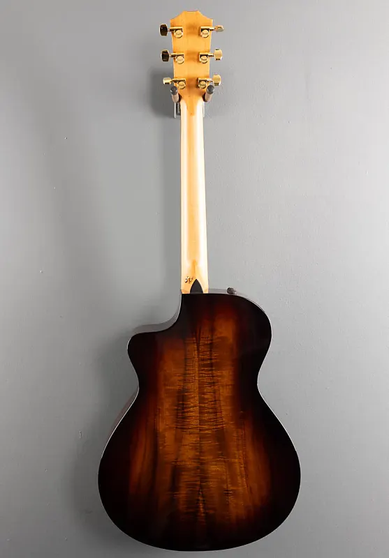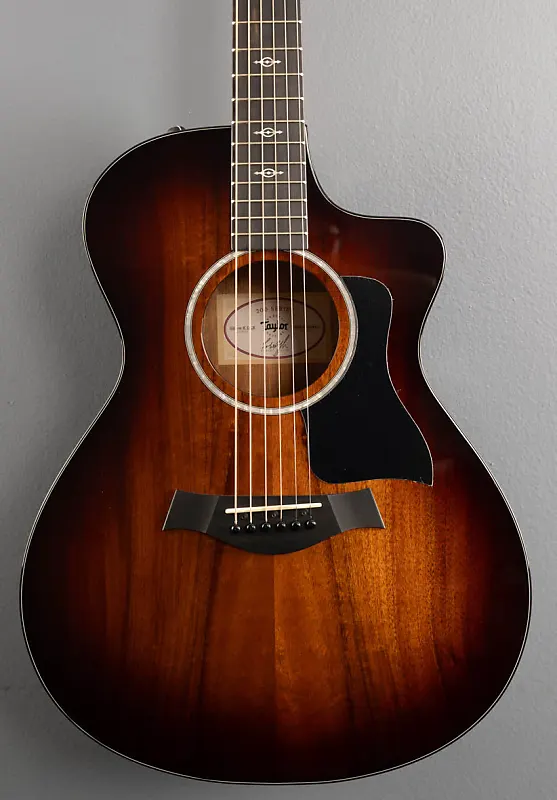 Shaded Edgeburst, корпус Grand Concert с венецианским вырезом, верхняя дека из гавайской коки, одинарная кольцевая розетка из искусственного перламутра, X-образная раскладка брусков, задняя и боковые части из многослойной гавайской коки, черная окантовка, гриф из сибирского эбенового дерева West African Crelicam с инкрустацией из искусственного перламутра Sentinel, нео-тропический махагониевый гриф, мензура 24 7/8 дюйма