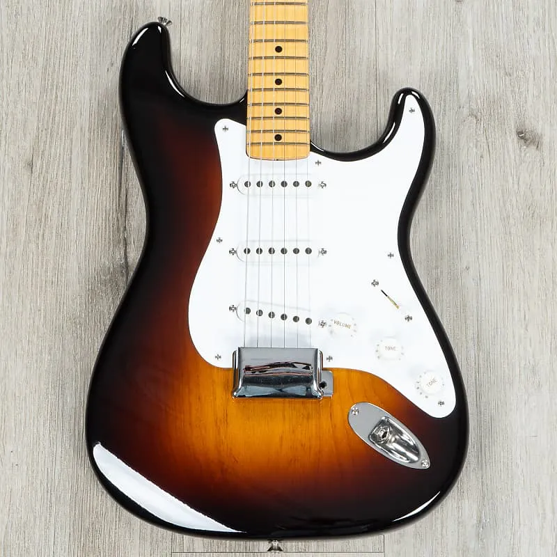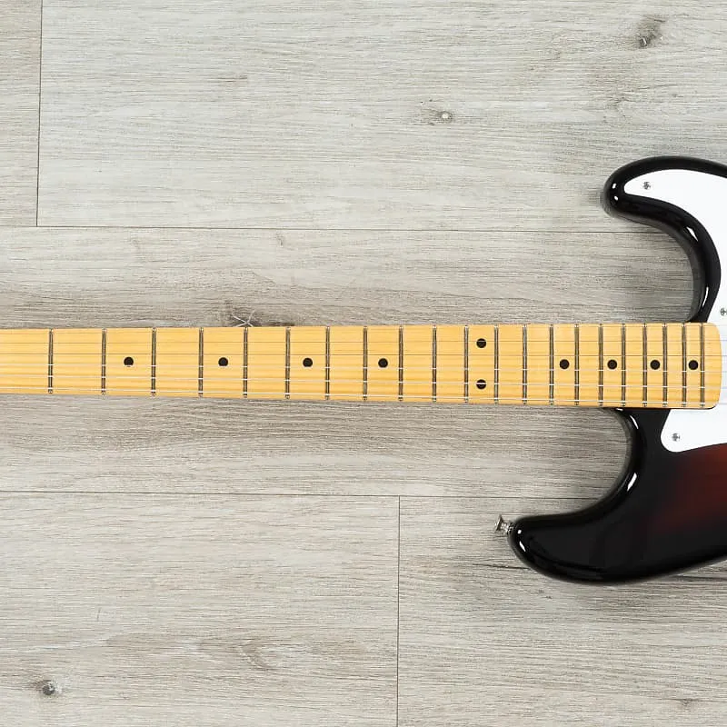 Более подробно о Лимитированной серии 70-летнего юбилея Stratocaster 1954 года, пакете Time Capsule, гриф из цельного кленового комплекта с радиусным рисунком, лакировка Wide-Fade двухцветный Sunburst