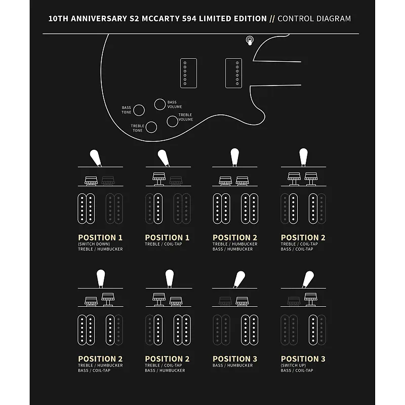 10-я годовщина S2 McCarty 594 базируется на оригинальных характеристиках S2 McCarty 594, сохраняя кленовую накладку, корпус из махагони, длину мензуры 24,594 дюйма, 22-ладовый гриф Pattern Vintage, двухкомпонентный мост PRS и колки винтажного стиля. Особые особенности включают: гриф из кубинского махагони, инкрустацию птиц из перламутра и - что особенно примечательно - звукосниматели PRS 58/15, произведенные в США. Звукосниматели LT и электроника. Звукосниматели PRS 58/15 LT («низкая индуктивность») вдохновлены винтажными моделями и имеют исключительную чистоту звучания. Они созданы для передачи сладости винтажных синглов и тепла хамбакеров конца 1950-х годов и были тщательно настроены с использованием процесса PRS TCI. Эти звукосниматели звучат живо и открыто с выраженным средним диапазоном и сбалансированными высокими и низкими частотами.
