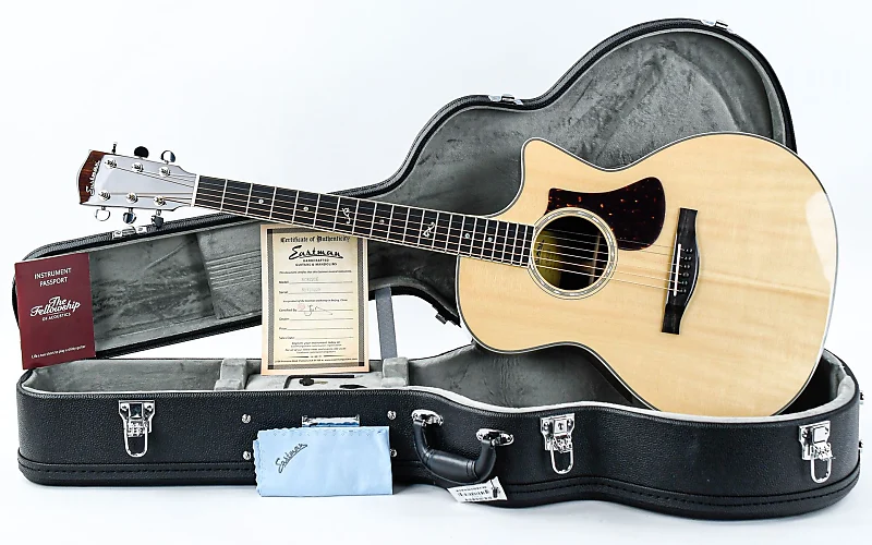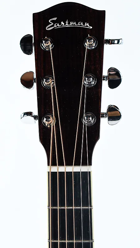 Grand Auditorium является настоящим гибридом, объединяющим характеристики меньших корпусов с объемом, мощью и басами дредноута, при этом не жертвуя ничем. Eastman также заботится о стилевом оформления гитары, включая перламутровую накладку на грифе и окантовку из ивороида.