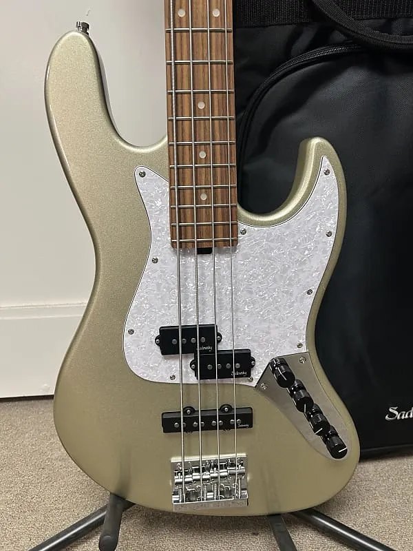 Версия для правой руки4-струнная электрическая бас-гитараДлина масштаба 34" (864 мм)Конструкция с прикручиваемой шеейКорпус из окоумеГриф из жареного кленаГрифовая накладка Morado (Pau Ferro)Радиус накладки 12"Головка грифа Sadowsky Just-A-Nut IIIШирина верхнего порожка 1.54" (39.2 мм)21 лад из никелевого серебра (ширина: 0.094" (2.4 мм) / высота: 0.051" (1.3 мм))Пассивный датчик Sadowsky P-Style (гриф)Пассивный, шумоподавляющий датчик Sadowsky J-Style в позиции 60-х годов (бридж)Активная 2-полосная электроника SadowskyРегуляторы: Громкость / Баланс / Высокие / Бас (P/P)Функция push/pull на регуляторе баса для обхода предусилителяОтсек быстрого доступа SadowskyЛегкие колки Sadowsky с открытым механизмомРасстояние между струнами у бриджа 0,748” / 19 ммРасстояние между самой тонкой и самой толстой струной 2,24” / 57 ммЗамки безопасности Sadowsky S-StyleБридж Sadowsky с быстрым выпуском струнХромированная фурнитураСтруны из нержавеющей стали 0,045 - 0,105Цельное покрытие Champagne Metallic High PolishГрифовая накладка White PearloidМаксимальный вес 10,6 фунтов (4,8 кг)В комплекте защитник грифa Sadowsky Fretboard ProtectorВ комплекте шестигранные ключиВ комплекте сумка Sadowsky PortaBag (SAC BAG BASS PORTA)Возврат возможен только если товар не соответствует описанию. Из-за высокой стоимости доставки мы не можем принять возврат на товар, который полностью соответствует описанию, но вам по какой-либо причине не нравится. Наши отзывы покупателей подтверждают, что мы честны в наших описаниях и всегда исправляйте ситуацию, если есть проблема с товаром. Пожалуйста, внимательно читайте описание и точно знайте, что вы покупаете.