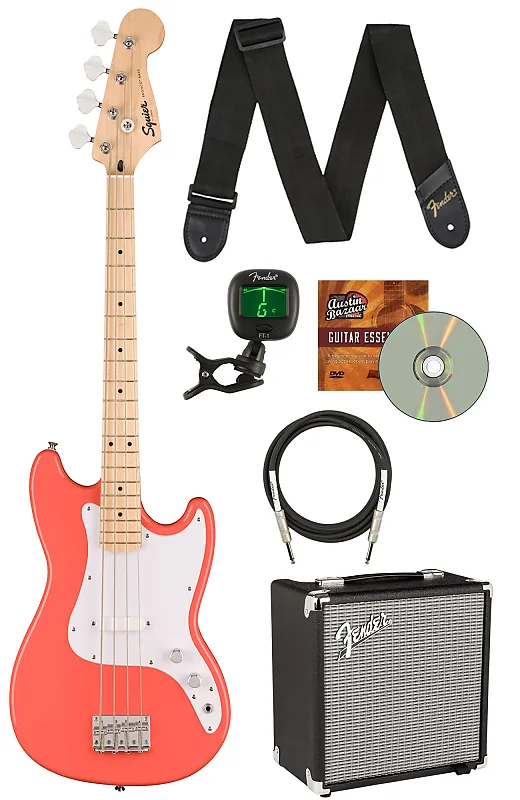 Fender Squier Sonic Bronco Bass - Комплект Tahitian Coral с усилителем Rumble 15, кабелем для инструмента, тюнером, ремнем и обучающим DVD от Austin Bazaar