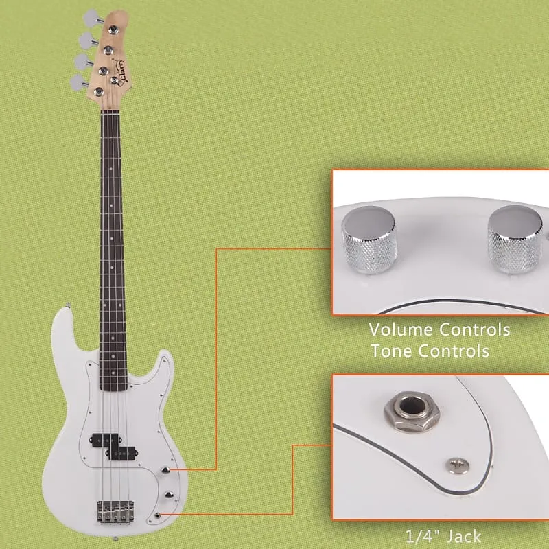 Этот набор для начинающих электробас-гитар поставляется со всеми необходимыми аксессуарами, включая 20-ваттный усилитель со встроенным динамиком, выходом для наушников и входным разъемом. Вы можете управлять громкостью, высокими частотами, средними частотами, низкими частотами и телефонами, чтобы найти свой звук.