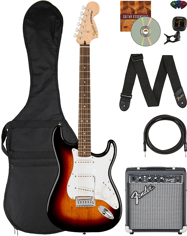 Fender Squier Affinity Stratocaster - комплект в 3-цветном Sunburst с усилителем Frontman 10G, кабелем для инструмента, чехлом для переноски, тюнером, ремнем, медиаторами и обучающим DVD от Austin Bazaar