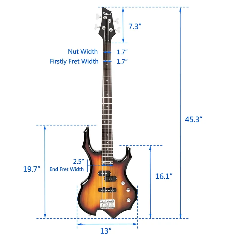 Эта электрическая бас-гитара обладает потрясающей формой «пламя», которая создает впечатление, что она горит. Премиальная инкрустация корпуса на грифе из палисандра выглядит эффектно и добавляет уникальности инструменту. Это идеальный подарок для любителей музыки, которые ценят оригинальные инструменты.