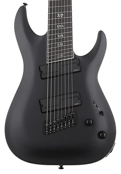8-струнная многомасштабная электрогитара с корпусом из болотного ясеня, гриф из клена/ореха/падаука, накладка из эбона и 2 активными хамбакерными звукоснимателями - сатиновый черный.