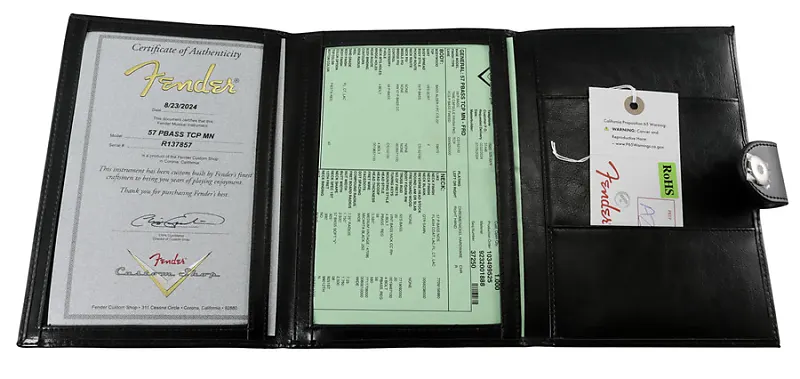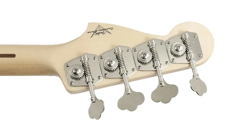 Ручной намотки '57 P Bass пикап обеспечивает идеальный винтажный низ и подключен к регуляторам громкости и тембра. Другие особенности включают винтажная однослойная перламутровая накладка цвета золота, четырехседельный винтажный басовый мост, винтажные колки, костяной порожек и дисковый струнодержатель. В комплекте роскошный твидовый жесткий футляр, ремень и сертификат подлинности.