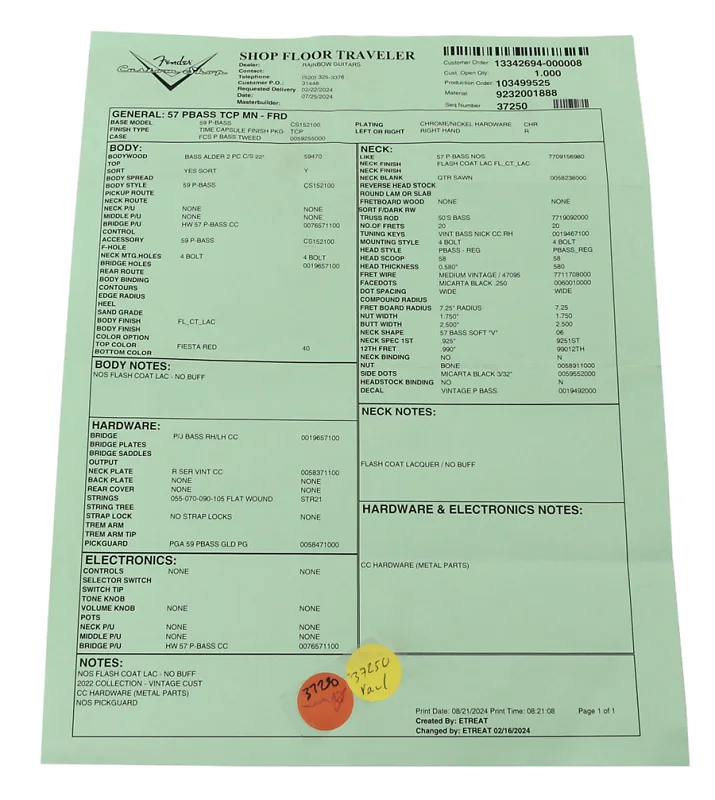 Винтажный кастомный бас '57 Precision Bass является примером флагманского дизайна, который многие годы задавал тон для электрического баса на сценах и в величайших записях всех времен. В этом уважаемом году была представлена теперь уже знакомая двухконтактная хамбакер-пикап с раздельными прямоугольными катушками и большая голова в стиле Strat. Мы заказали этот инструмент у Custom Shop Fender в цвете Fiesta Red. Корпус выполнен из двух частей отборного ольхи и покрыт лаком NOS thinner "Flash Coat", что обеспечивает лучшую резонансность корпуса. Цельный четвертованный кленовый гриф имеет профиль '57 “soft V”, накладку 7,25” радиусом и 20 средних винтажных ладов (47095).