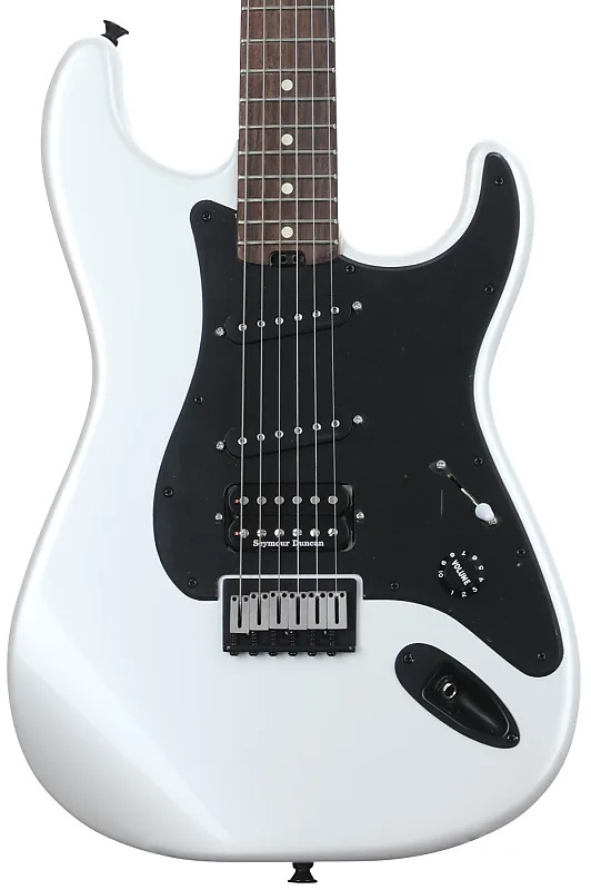 Электрогитара с цельным корпусом, модель Signature с корпусом из ольхи, гриф из клена, накладка на гриф из розового дерева, 2 сингловых звукоснимателя и 1 хамбакер - жемчужно-белого цвета.