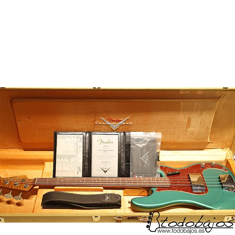 Другие особенности включают радиус 7,25 дюйма, 20 средних джамбо-ладов (узкие высокие 6150), бридж в винтажном стиле со стальными седлами с резьбой, тюнинговые штифты в винтажном стиле, костяную сехуэлу, жесткий чехол, ремешок и сертификат подлинности.