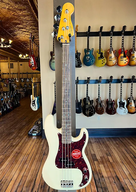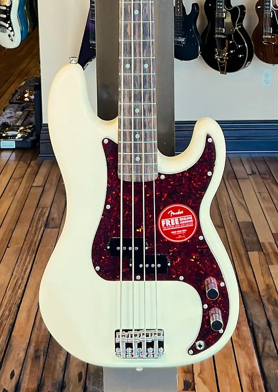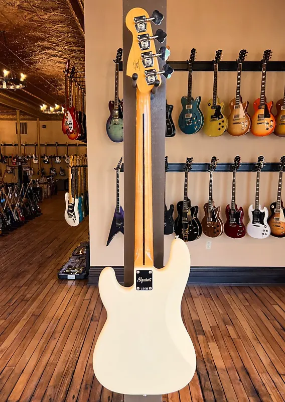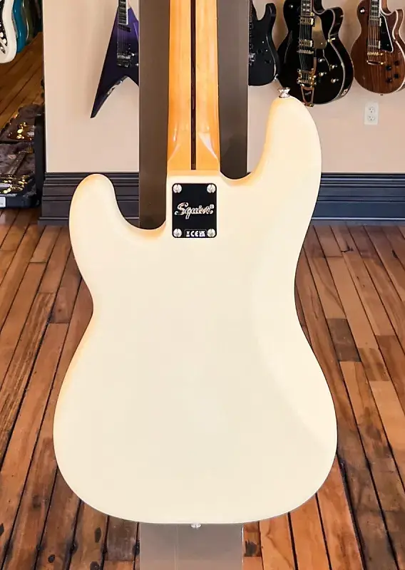 Цвет Olympic White, сделано в Индонезии, корпус из тополя, глянцевая полиуретановая отделка корпуса, гриф из клена в форме «C» с накладкой из индийского лавра радиусом 9,5 дюйма и высоким узким ладом, длина мензуры 34 дюйма, ширина мортона 1,685 дюйма, звукосниматель Precision Bass с Alnico сплит-койл по дизайну Fender с регулировкой общей громкости и тембра, винтажный мост с резьбовыми стальными седлами. Тюнеры в винтажном стиле, футляр не включен