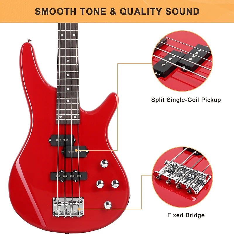 Наша электрическая бас-гитара поставляется с портативной сумкой для удобной транспортировки, плечевым ремнем, медиатором для бас-гитары и шнуром усилителя, что позволяет легко начать играть прямо из коробки. Этот полный пакет включает в себя все необходимое для начала работы и оттачивания навыков игры на бас-гитаре.