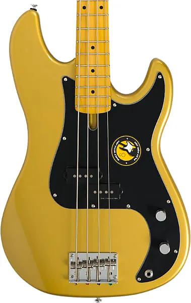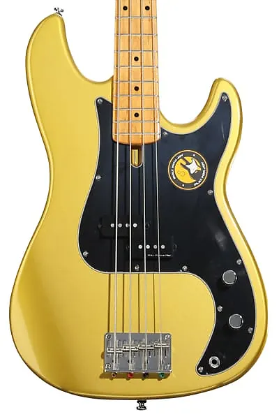 Электрический бас с корпусом из ольхи, грифом из клена, ладовой доской из клена и одним сплит-кор-пикапом - металлический золотой.