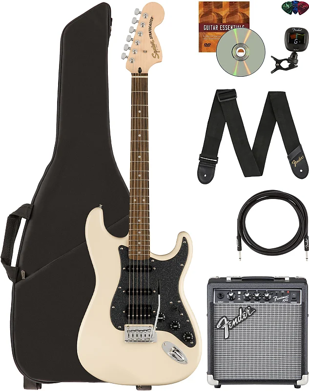 Комплект Fender Squier Affinity Stratocaster HSS - Olympic White с усилителем Frontman 10G, кабелем для инструмента, чехлом, тюнером, ремнем, медиаторами и учебным DVD от Austin Bazaar