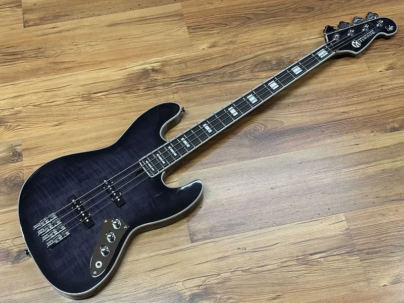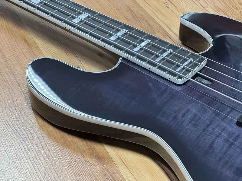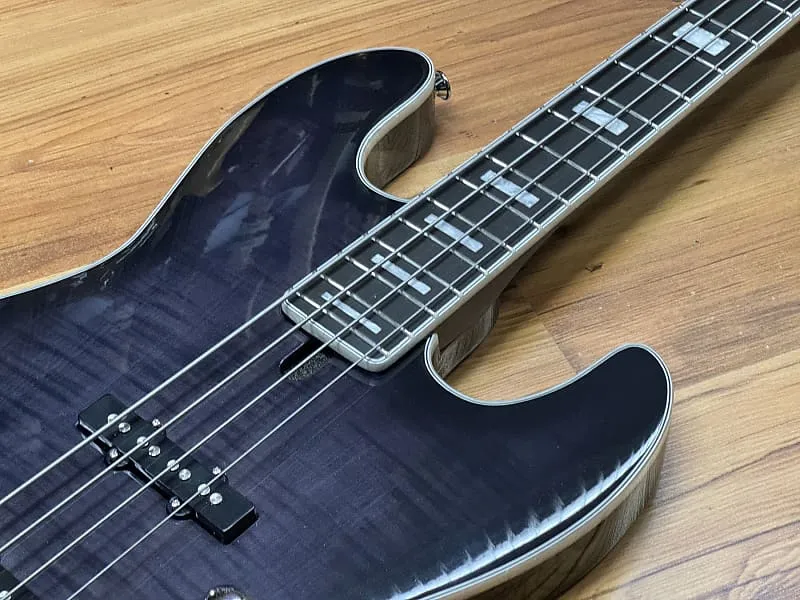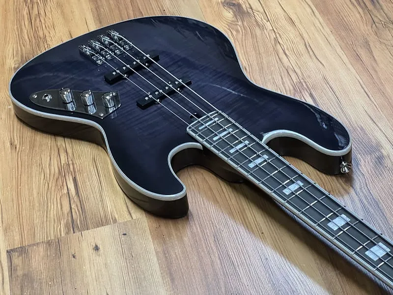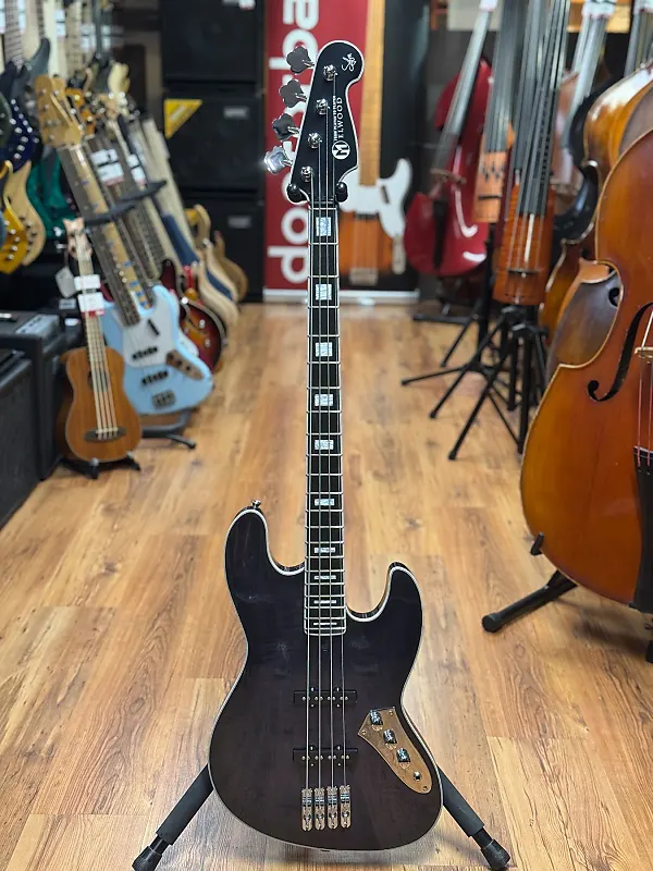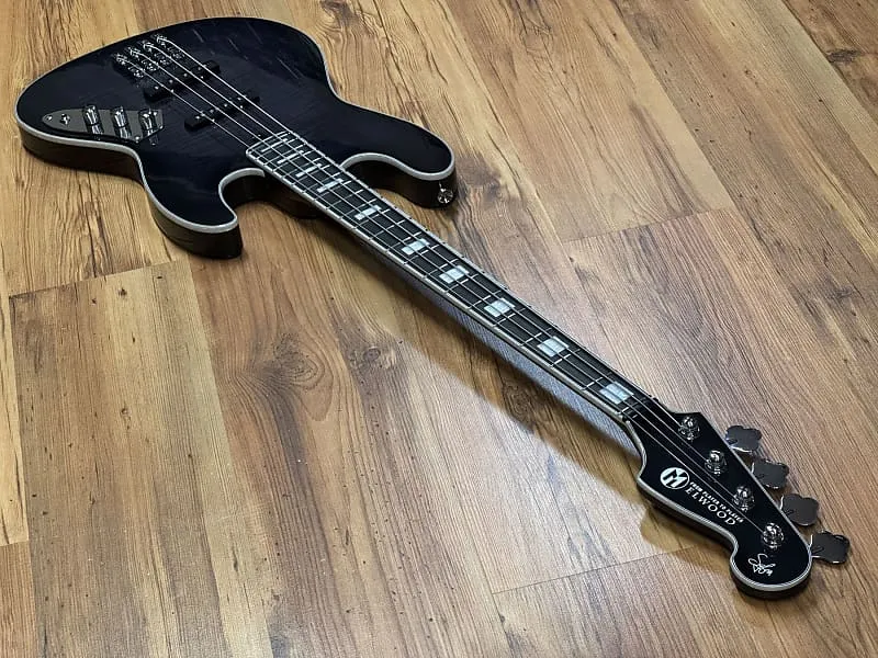 Нам очень нравится модель Elwood Absolution. Она основана на классической модели Elwood (Jazz Bass), но с множеством действительно невероятных деталей, таких как кленовая верхняя дека и задняя дека с огненной текстурой, кленовый гриф с огненной текстурой и подходящей головкой грифа, эбеновая накладка с инкрустацией MOP и полная окантовка корпуса, грифа и головки грифа.