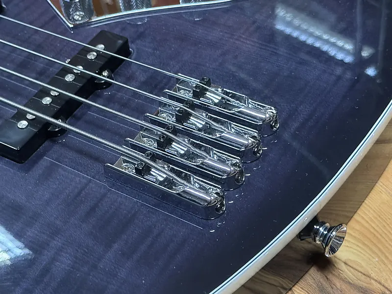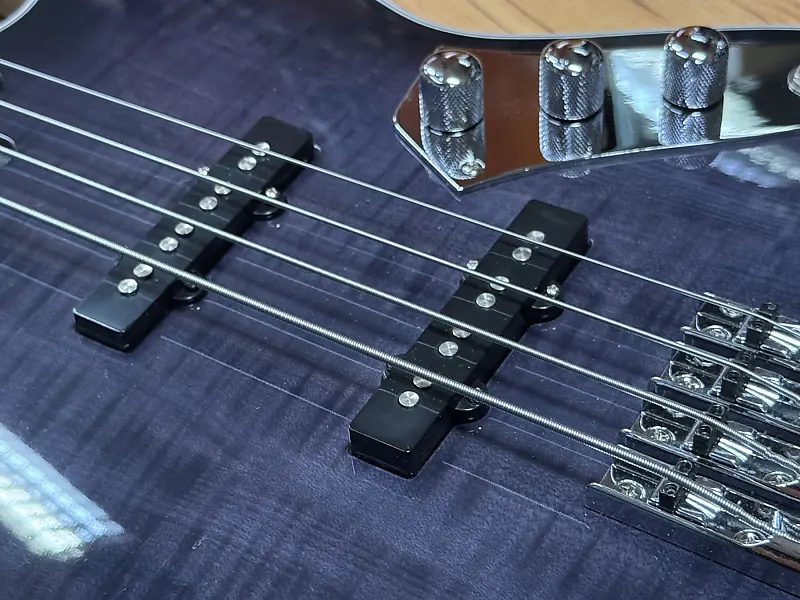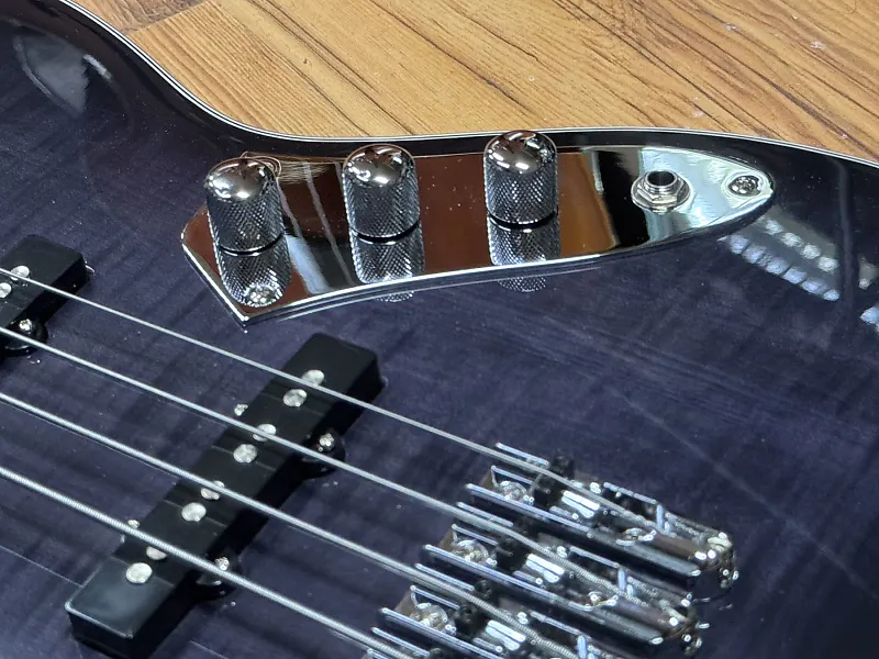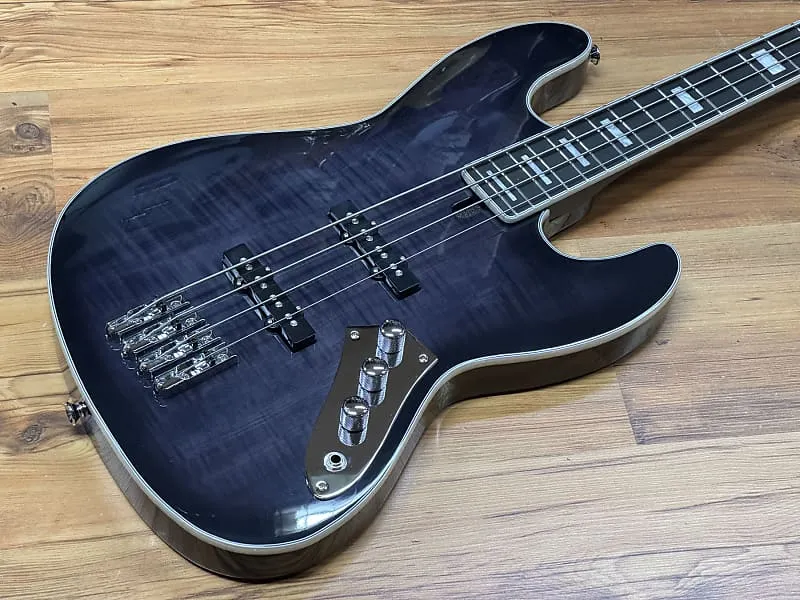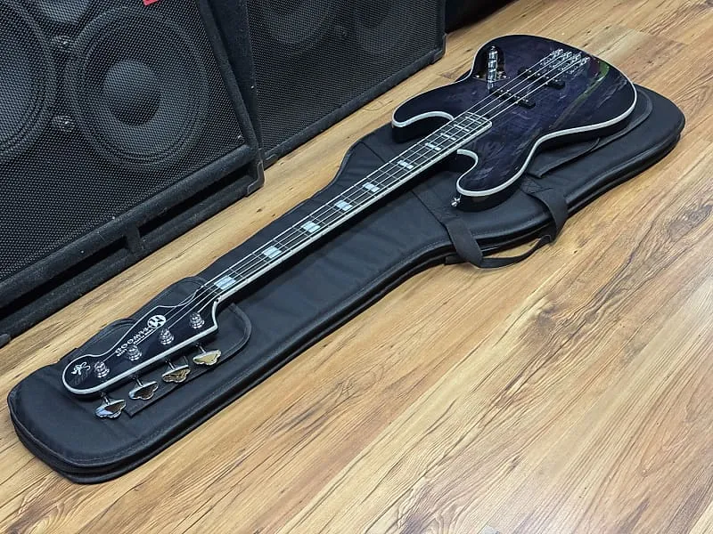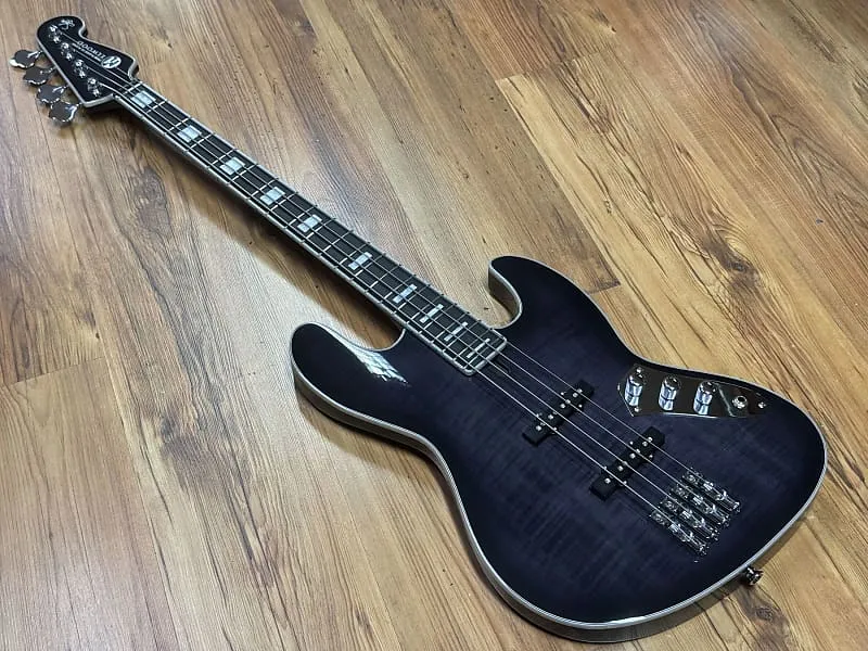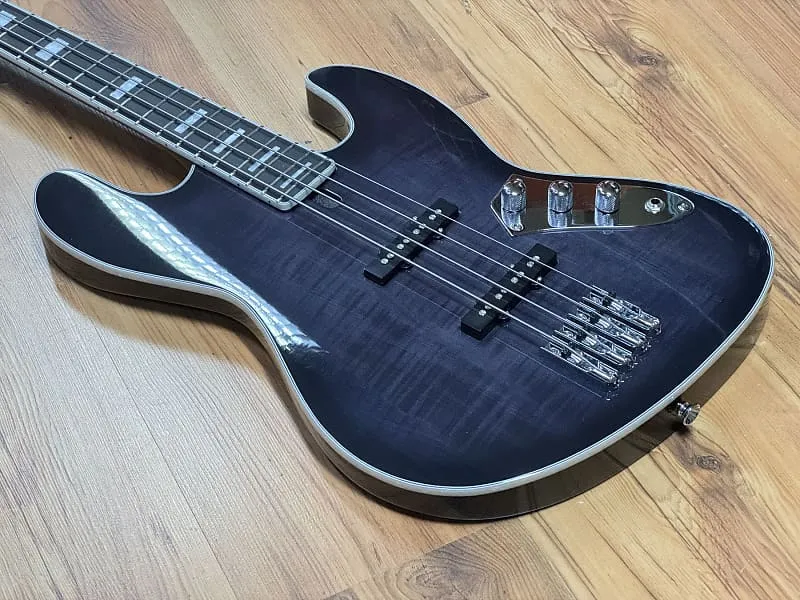 Нам очень нравится модель Elwood Absolution. Она основана на классической модели Elwood (Jazz Bass), но с множеством действительно невероятных деталей, таких как кленовая верхняя дека и задняя дека с огненной текстурой, кленовый гриф с огненной текстурой и подходящей головкой грифа, эбеновая накладка с инкрустацией MOP и полная окантовка корпуса, грифа и головки грифа.