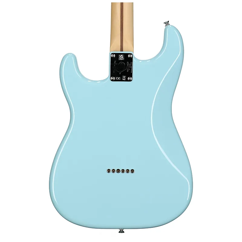 Удобная современная шейка «C» оснащена медиум-джамбо ладами на грифе из палисандра с радиусом 9,5” для современного ощущения и превосходной игры. Среди других особенностей - тюнеры в винтажном стиле и жесткий мост Stratocaster с блочными седлами для классического внешнего вида, отличной интонации и повышенной стабильности настройки. Персонализированная пластина грифа Tom DeLonge украшена оригинальным рисунком ДеЛонге.